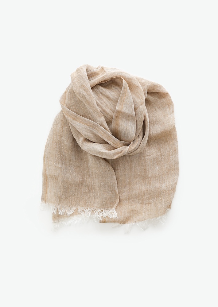 フィンランドのテキスタイルブランド「ラプアンカンクリ」のリネンストール。ふんわり包み込むような優しい着用感。とても軽いので、高齢の女性でも身に着けやすいですよ。