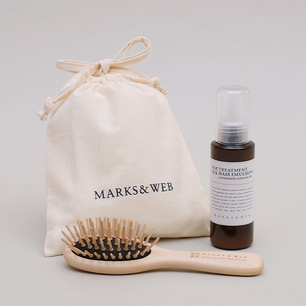 「MARKS&WEB」のブラシセットは、キューティクルに優しい木製ヘアブラシと髪にうるおいを与えてくれる乳液タイプのヘアトリートメントにポーチまでついた豪華なギフト。タオルドライ後にブラシとトリートメントを一緒に使えば効果も倍増!美髪へと導いてくれます。