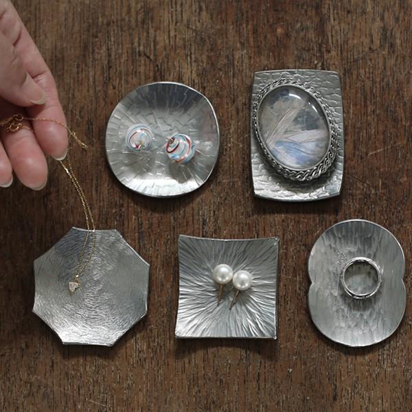 一枚づつ異なるデザインが楽しめる「大阪錫器」の錫製小皿5枚セット。豆皿感覚で薬味置きや箸置き、またジュエリートレイとしても活用できます。酸化しにくい錫素材は、お手入れも簡単。いつまでも長く愛用していただける、センスある贈りものです。