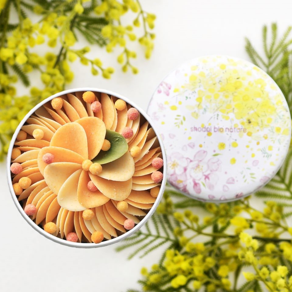 「Shodai bio nature」の「ミモザのペタル」は、花びらのようなチョコレートがたっぷり入った華やかなスイーツ。オーガニック素材や自然由来素材にこだわった身体にも優しいチョコレートです。柚子や甘夏などを原料にした香り豊かで軽やかなくちどけが特徴。「感謝」を意味するミモザは、異動する女性への花束の代わりにもおすすめ。
