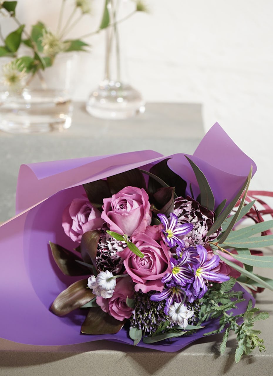 ボリュームたっぷりの生花の花束は、女性にとって心がときめくプレゼント。70歳のお祝いに贈るなら、やっぱりパープル系のお花をまとめて贈りたいですね。