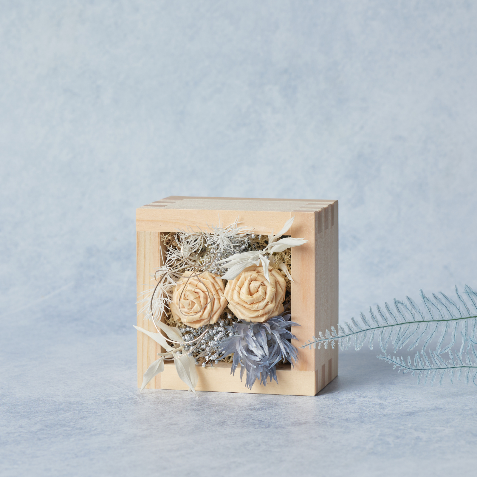 ヒノキ枡に入ったプリザーブドフラワーやドライフラワーに、精油を垂らしてふわりと香りを広げるタイプのディフューザー。もちろんお好みのアロマオイルを使うことも可能。センス良い!と褒めてもらえそうな贈り物になりますよ。
