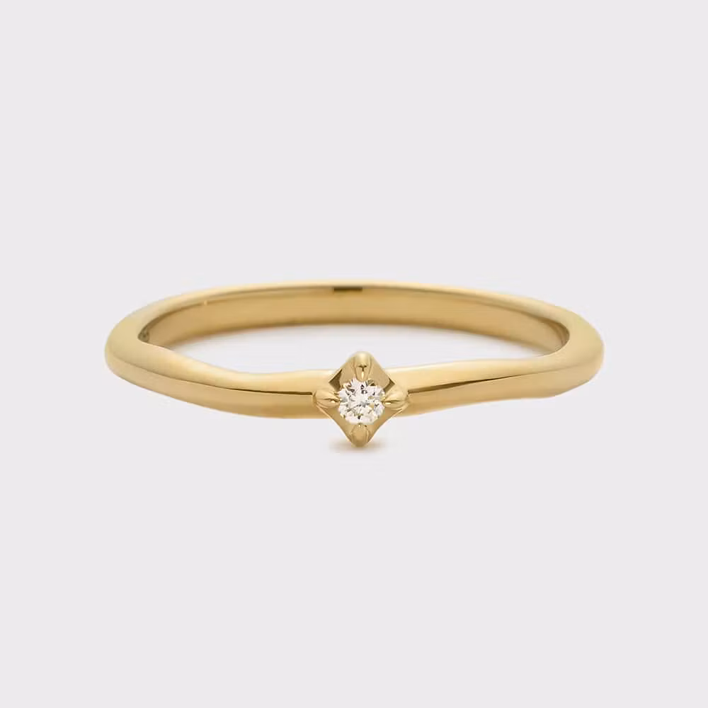 「NOJESS」の「ゴールドタイヤモンドリング」。柔らかく光るゴールドのリングは、4本の爪がダイヤモンドを包み込むことで優しい表情に。一粒の星のようなダイヤモンドをあしらって、クリスマスらしい詩的なデザインに仕上がっています。個性的なリングに彼女もうっとり。