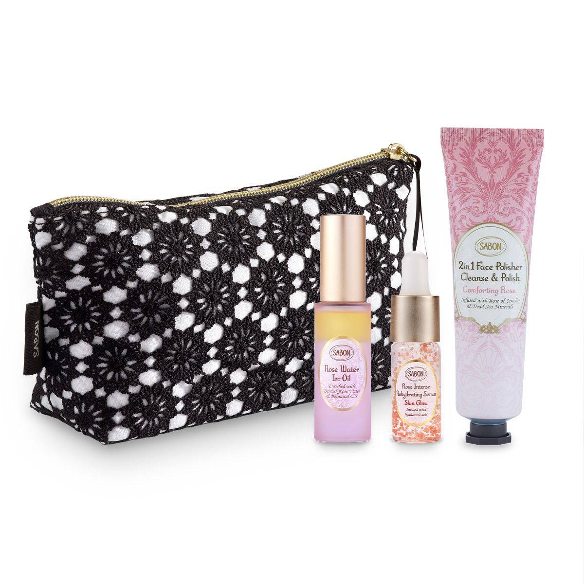 「SABON」のスクラブ洗顔・ミスト化粧水・保湿美容液のミニトリオキット。幸福肌へ導くローズフェイスケアラインシリーズ。肌本来のみずみずしさを取り戻し、弾けるようなハリとツヤを叶えてくれます。黒のレースポーチ付きのおしゃれなギフトセットです。