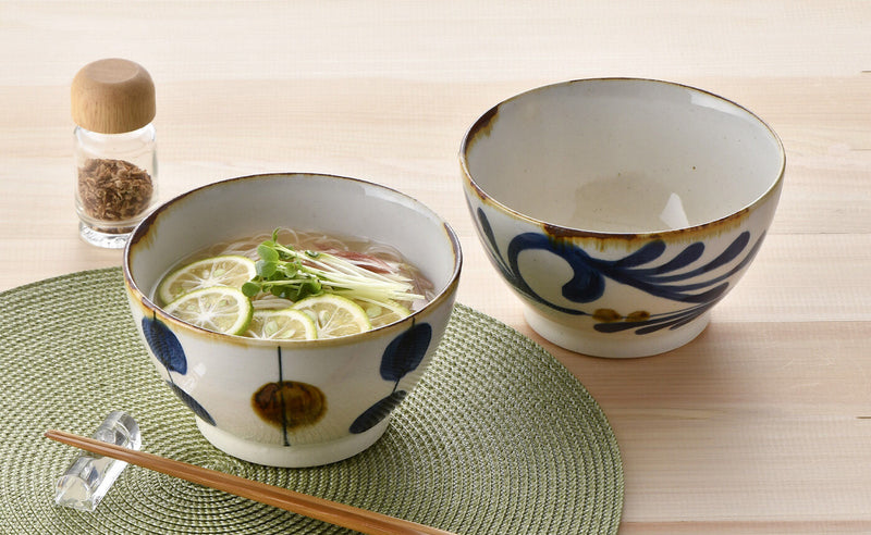 伝統的な絵付け技法で、大胆にモチーフを描いています。ご飯茶碗より大きめで袋麺がちょうど入るサイズ。口径が広すぎないので、きれいに盛り付けられます。見た目より軽く、扱いやすいのがGOOD。