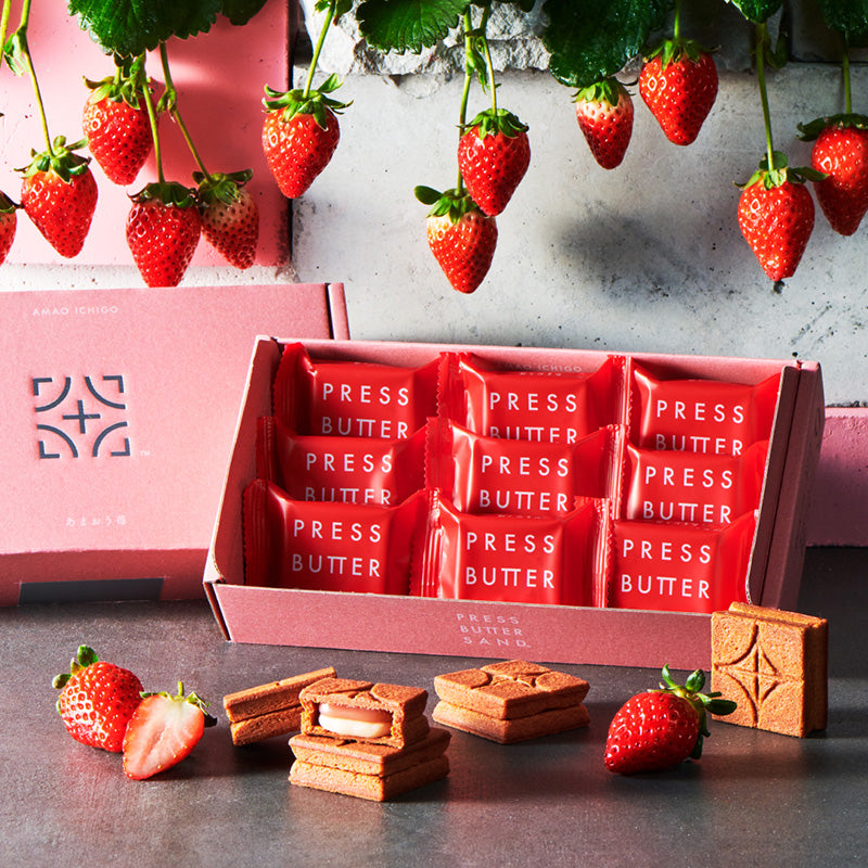 「PRESS BUTTER SAND」のあまおう苺のバターサンド。あまおう苺のジャムが入ったバタークリームと、あまおう苺の果汁を使用したバターキャラメルをクッキーでサンド。サクッとした口あたりと、舌の上でとろけるようなイチゴの甘さにうっとり。イチゴをイメージした真っ赤なパッケージもオシャレですよ!