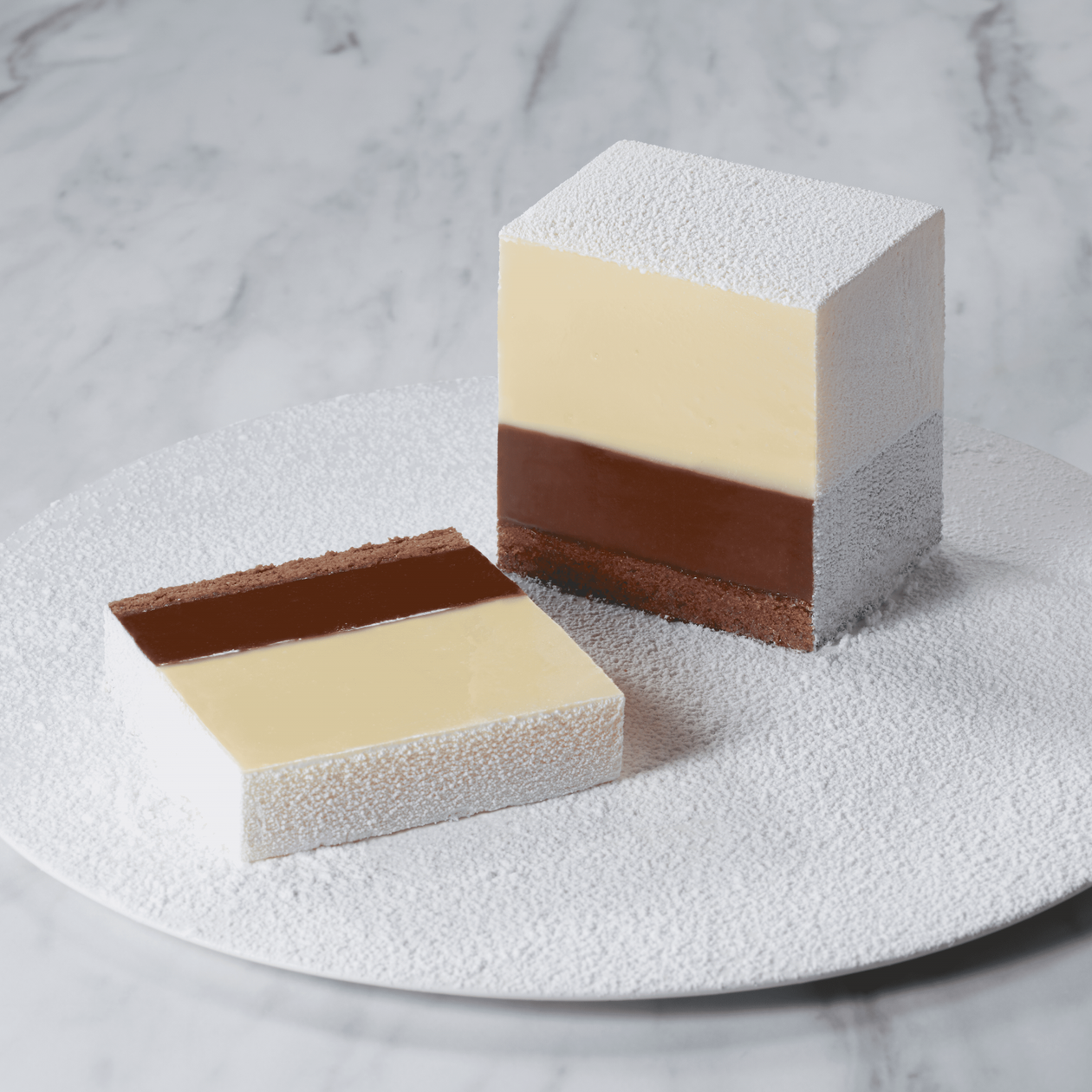 こだわり素材を贅沢に使ったホワイトガナッシュ、ミルクチョコレート、しっとり仕上げたブラウニーの3層構造。どこをカットしても美しい断面&とろける食感に思わずうっとり。「至極」の名にふさわしい絶品です。