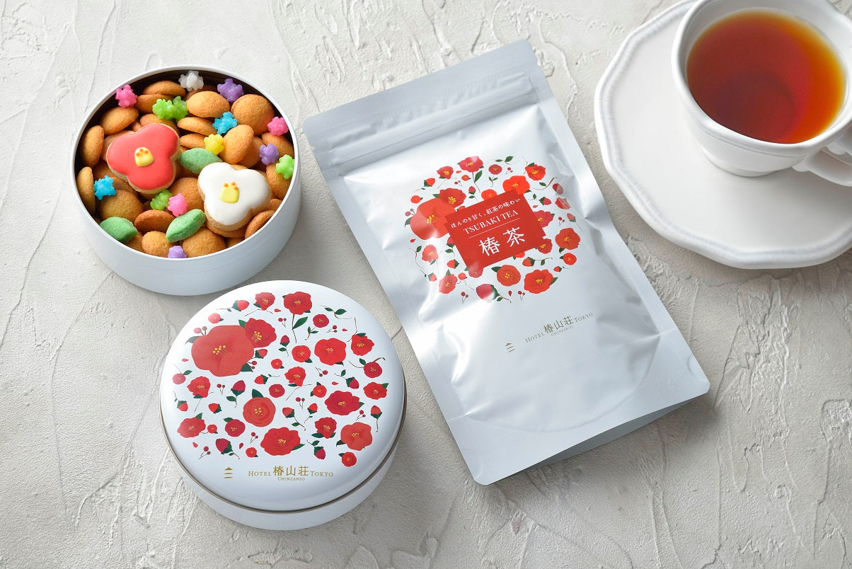 ホテルで人気の椿コレクション、椿茶と缶入りふきよせのギフトセット。鮮やかな椿が描かれた缶を開けると、カラフルでかわいいクッキーや金平糖が詰まっています。華やかなメッセージカードを添えてゆったりティータイムを楽しんでもらいましょう。
