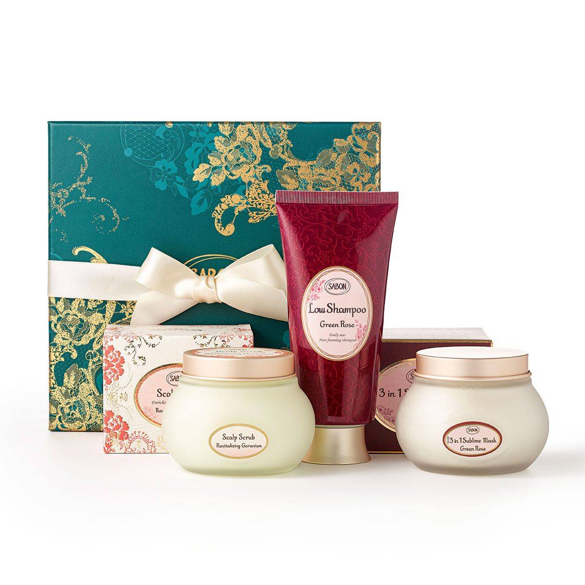 セットになっている「ヘッドスクラブ」「ローシャンプー」「ヘアマスク 3in1」の3つのアイテムは、どれもヘアコンディションが格段に上がると人気の高い名品。愛されるグリーン・ローズの香りに包まれながらご褒美タイムを満喫してもらいましょう。