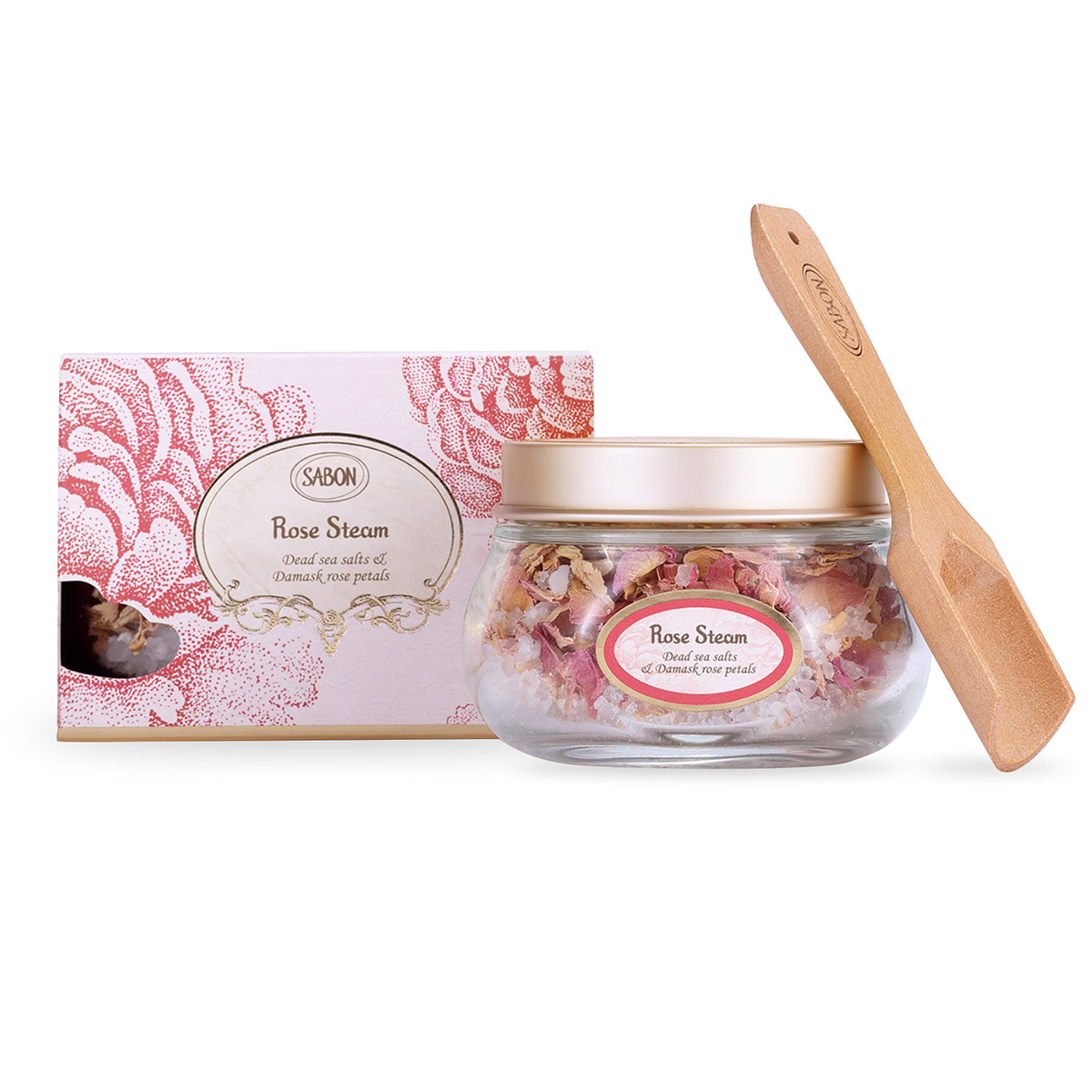 おしゃれな瓶に入っているのはオーガニックダマスクローズの花びらと、ミネラル豊富な死海の塩。これを熱湯に入れることで、自宅で手軽にスチーム美容を実践できます。