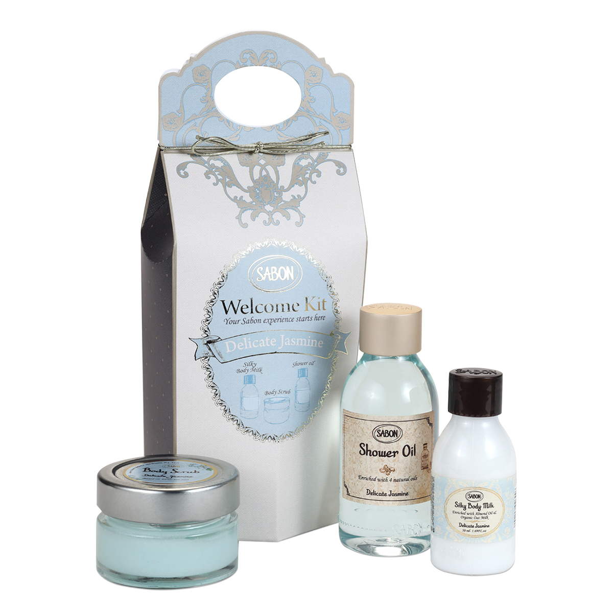 SABONを知らない方にもおすすめなのは、こちらの「ウェルカムキット デリケート・ジャスミン」。誰からも愛されるデリケート・ジャスミンの香りのシャワーオイル、ボディスクラブ、シルキーボディミルクのトライアルサイズがセットになっています。