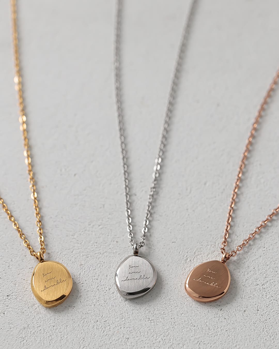 ラウンドプレートのネックレス。金属アレルギーが出にくいチタンを18Kコーティング加工。ラグジュアリーな質感に仕上げています。ほどよく上品なサイズ感で、華奢なデコルテを演出。シンプルで飽きの来ないデザイン。オンオフ問わず身に着けられます。