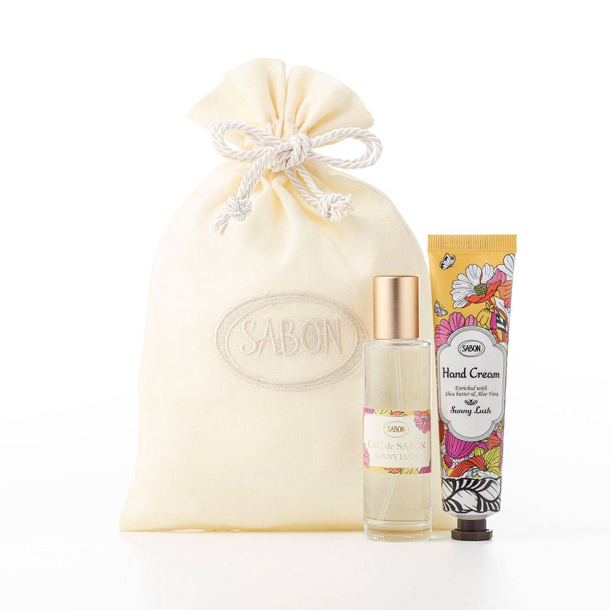 サニー・ラッシュのフレグランスとハンドクリーム、ダブルでプレゼントできるのが「SABON」のギフトセット。初夏の庭園を彷彿させるフローラルシトラス香り、ロゴ入り巾着に入っているのも嬉しいですね。