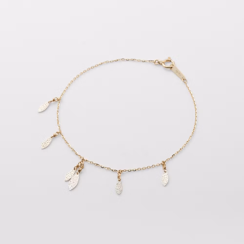 ageteのブレスレットは、別売りのアジャスターチェーン(K10)をつければアンクレットとしても使用可能。例えば、こちらのゴールドチェーンにリーフプレートがついたブレスレットにも。ファッションや気分に合わせて使い分けられる便利なアイテムです。