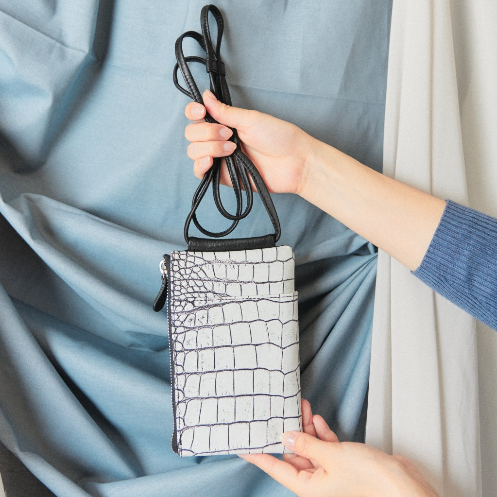 人気ブランド「VIA DOAN」のショルダーバッグ。牛革をクロコ調に加工。職人の手作業による目地染めのコントラストが美しい仕上がりです。スマホや貴重品をコンパクトにまとめられるサイズ。お財布代わりや、旅先でのサブバッグに。