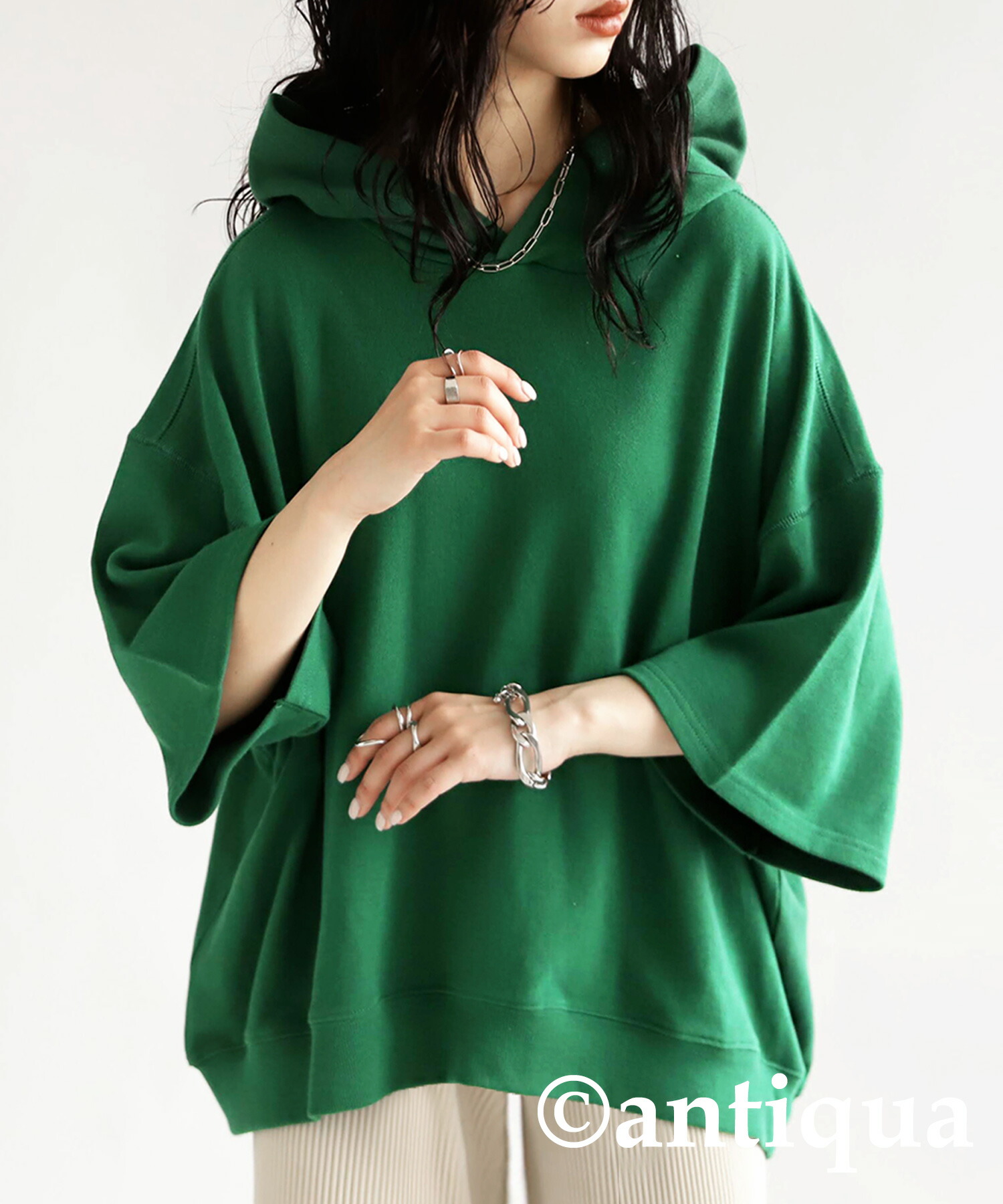 「アンティカ」のパーカーは、肘位の長さの半袖裏毛パーカー。ヒップをすっぽり隠して、ファッションのアクセントにもなるアイテム。ドロップショルダーでこなれ感もプラス。しっかりとした生地感で高見えします。
