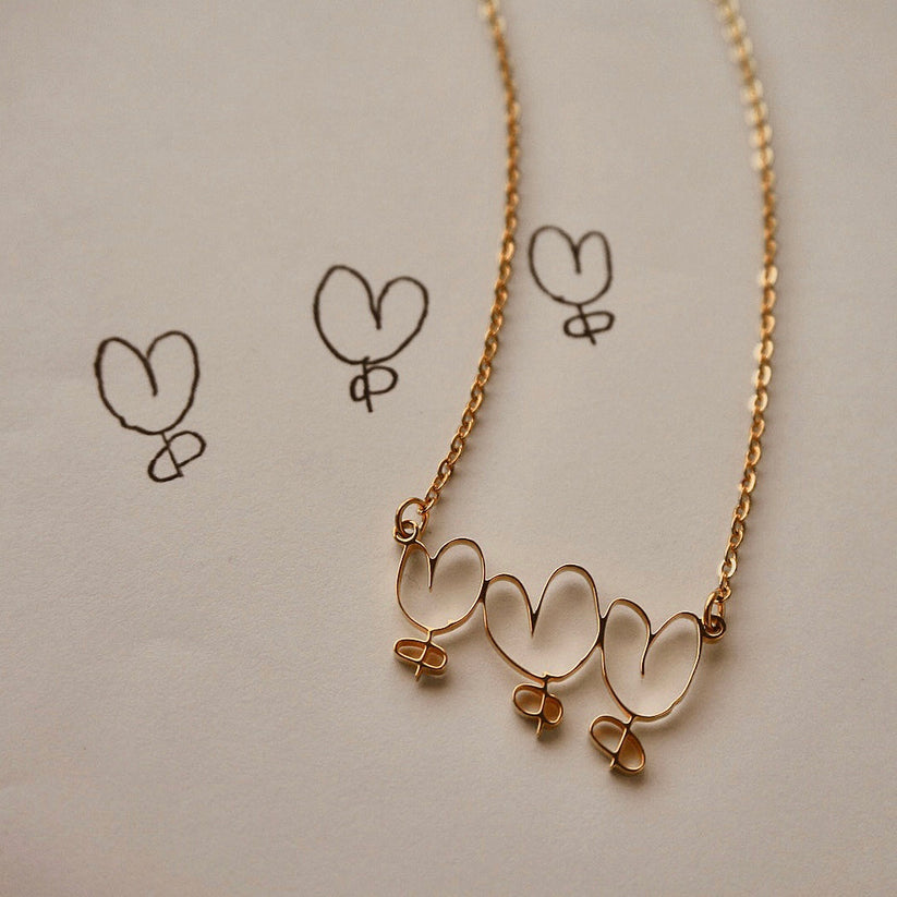注文も簡単で、自分で紙に書いた文字やイラストを撮影してアップロードするだけ。サイズやチェーンの長さも選べて自由度が高いのに、5,000円前後でオーダーできちゃうって感動!